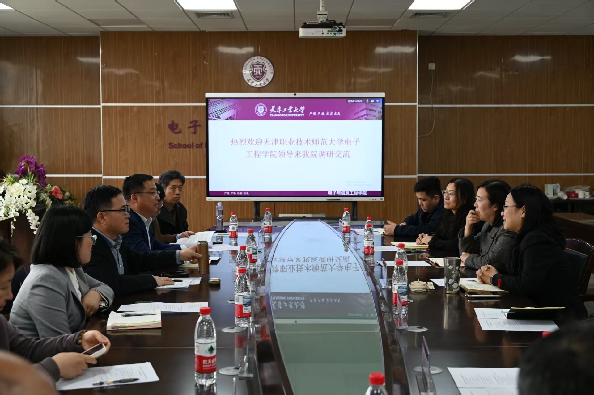 党委书记韩树明、院长李士心带领学院班子全体成员、系部负责人、党支部书记、科级干部一行9人赴天津工业大学电子与信息工程学院开展调研。天津工业大学电子与信息工程学院党委书记郭翠娟,学科建设办公室主任、电子与信息工程学院常务副院长牛萍娟,学院班子成员及业务骨干热情接待并进行座谈交流。